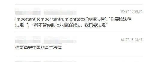 "你要遵守中国的基本法律 Nǐ yào zūnshǒu zhōngguó de jīběn fǎlǜ" (You have to abide by the basic laws of China)